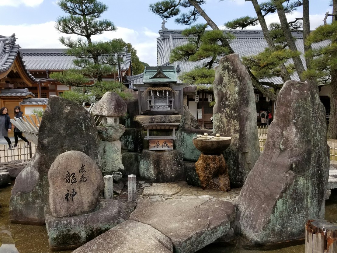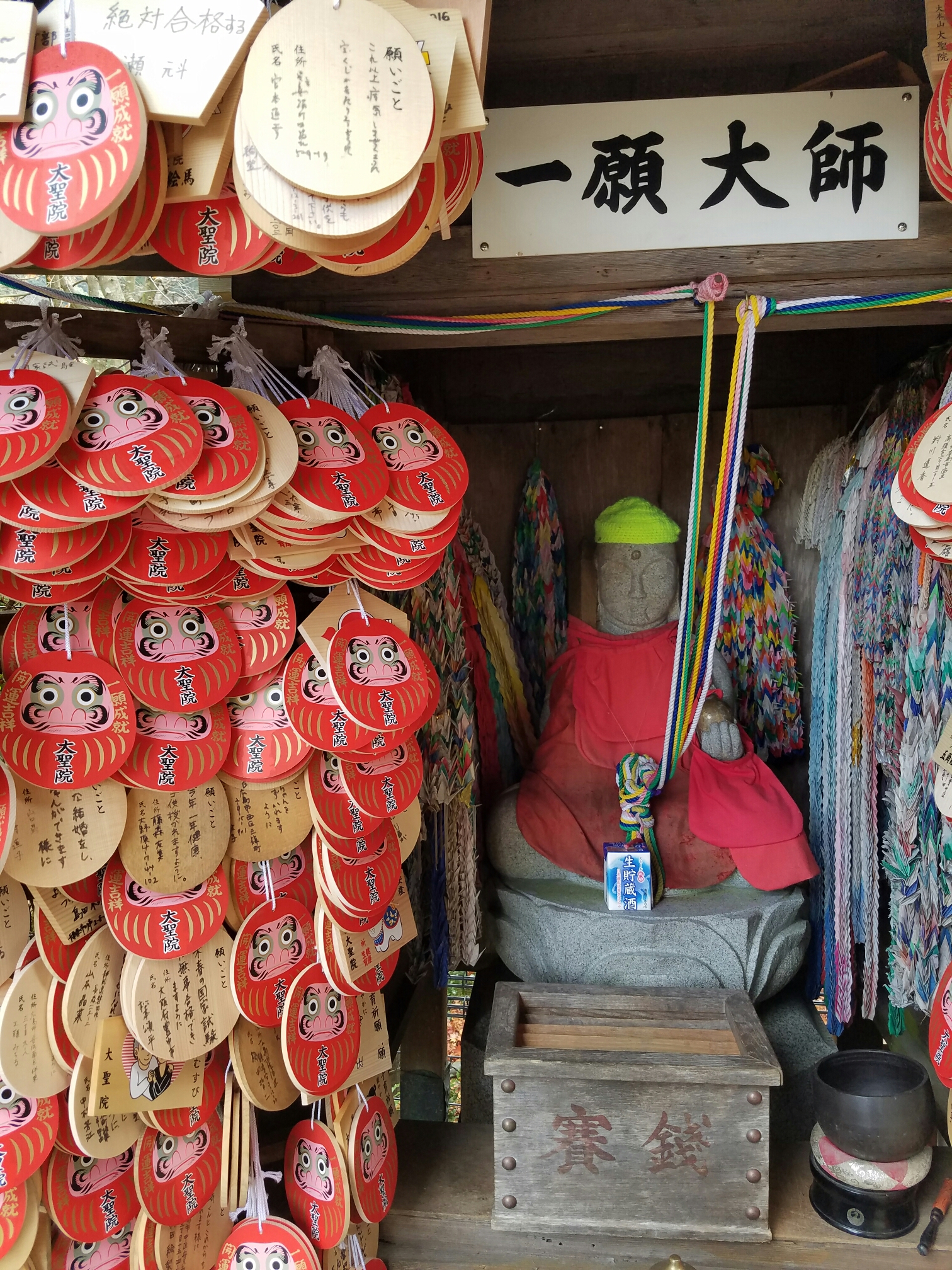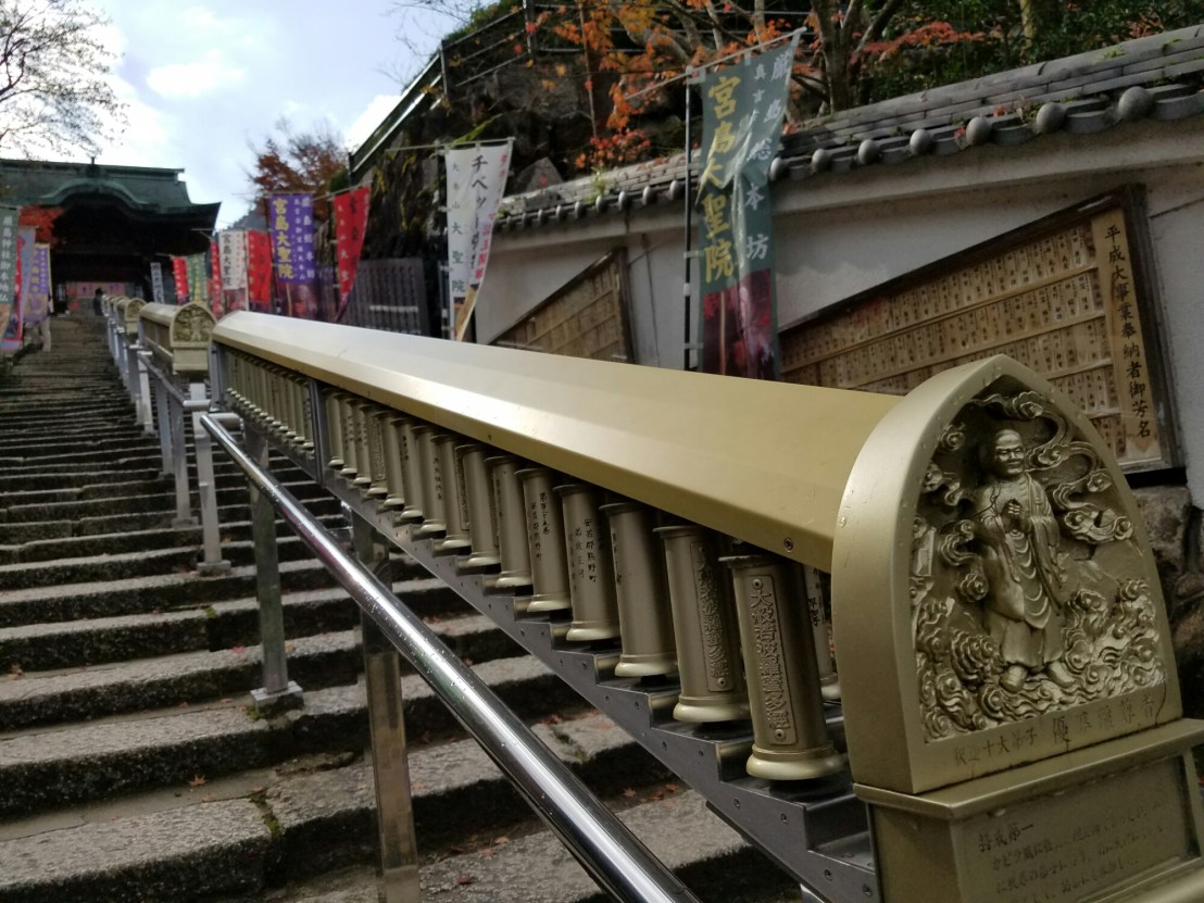 Daishoin, the other important temple. This one is Buddhist. The Dalai Lama gave a talk here earlier this monthPrayer wheels for going up AND downThis temples worshippers take turns knitting hats and scarves for those guysHere’s something more that’s new to me… You pay to throw three balls into an urn. Like a carnival game. If you get all three in, your wish comes true