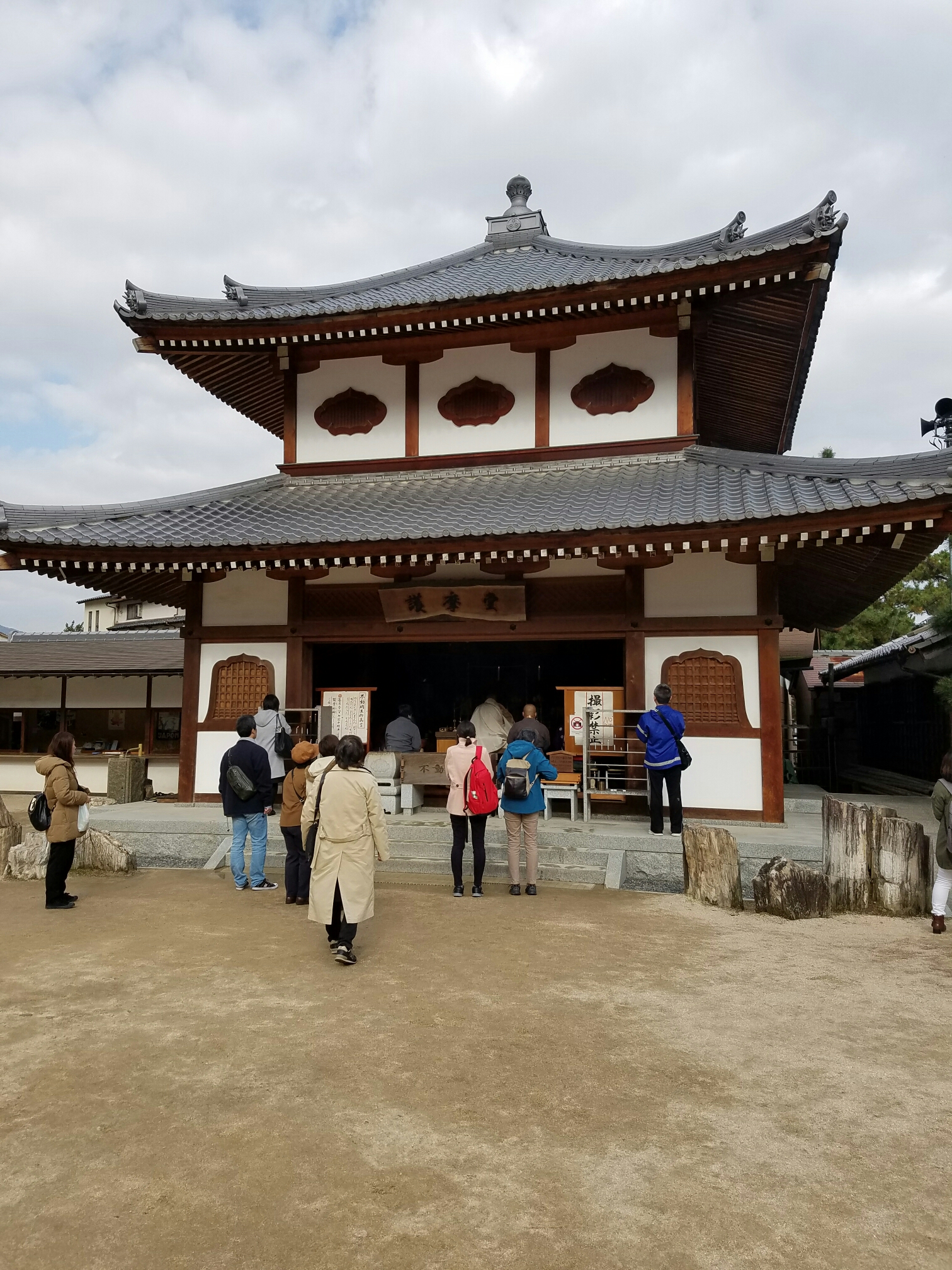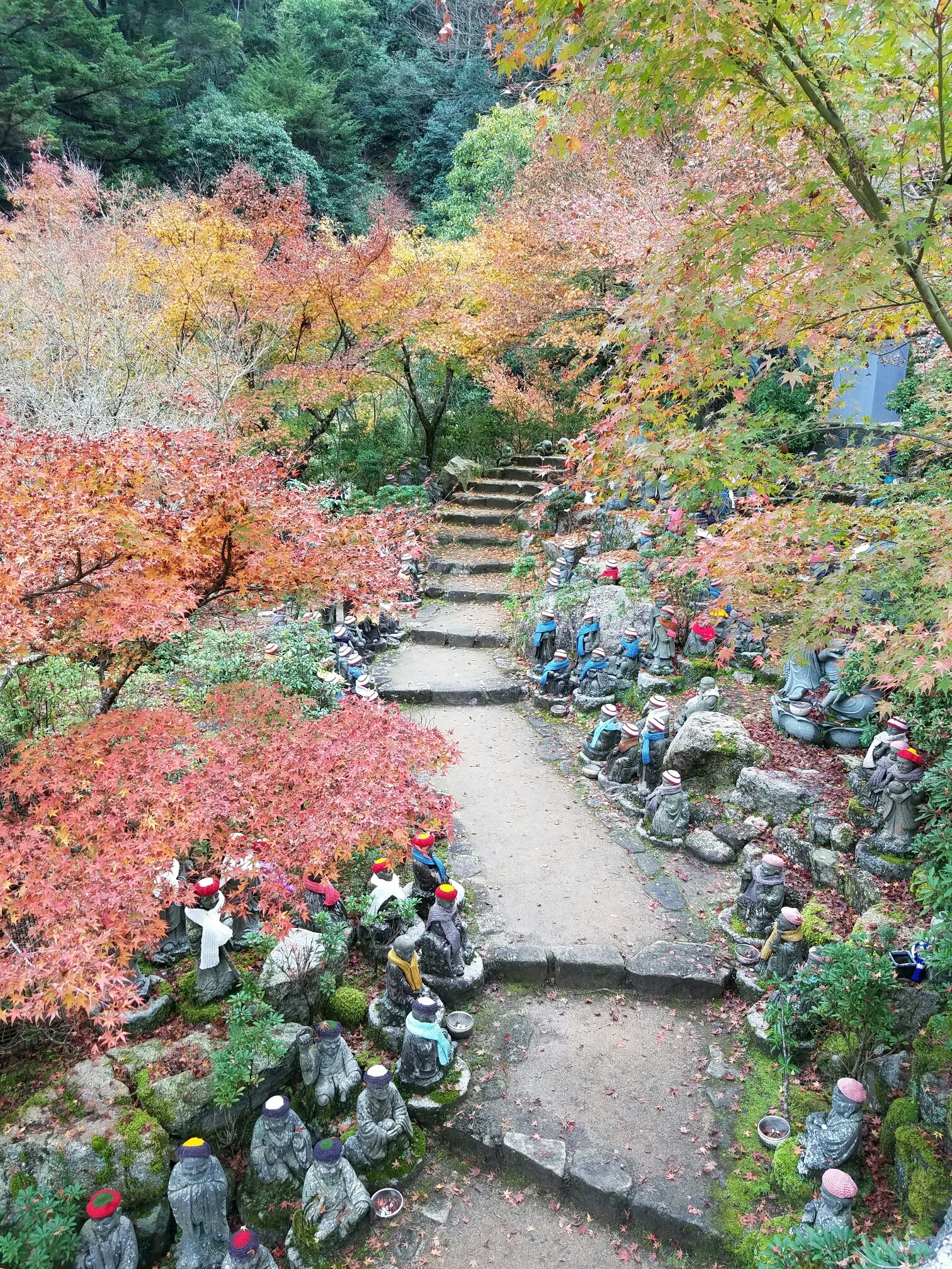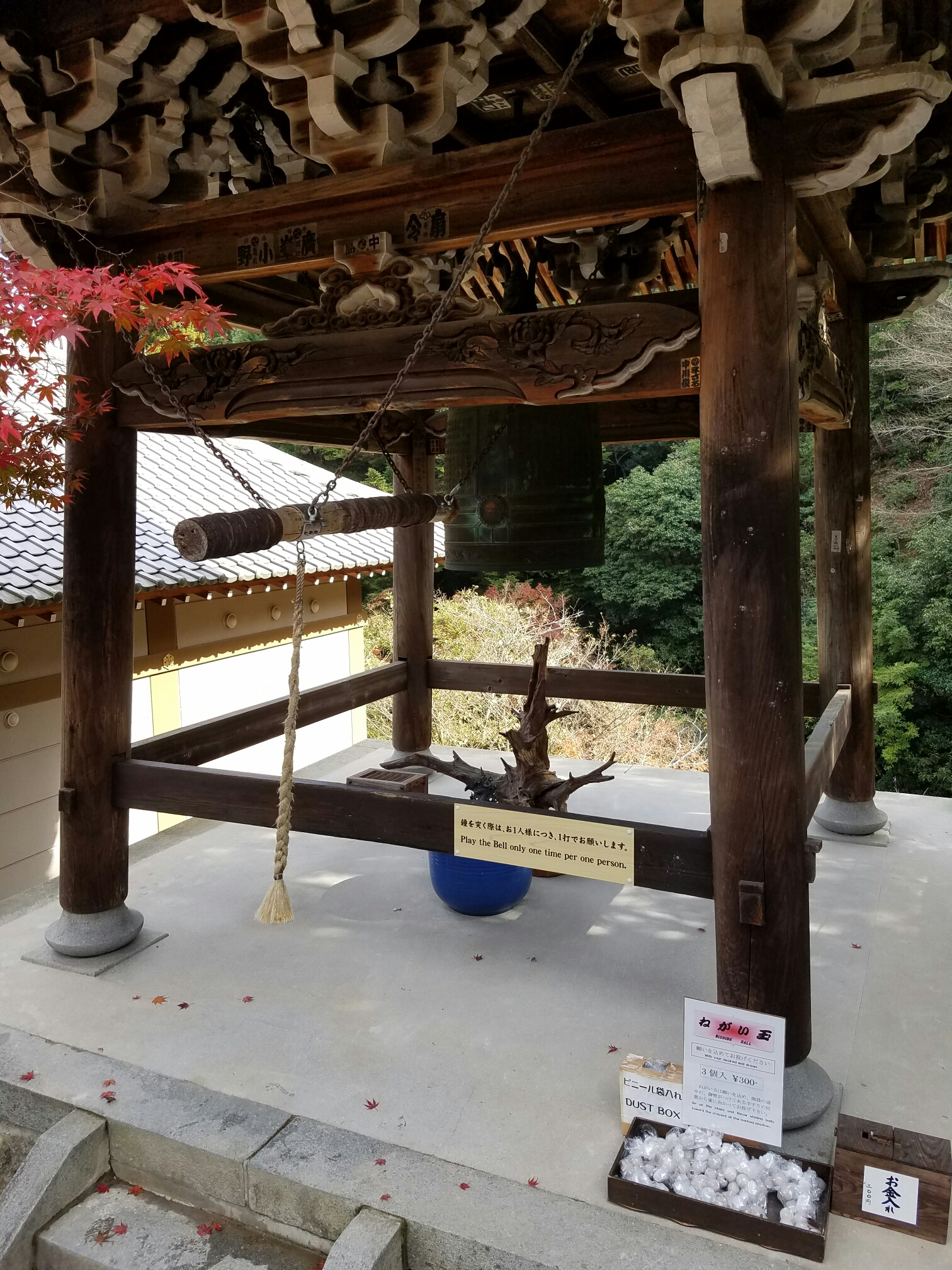 Daishoin, the other important temple. This one is Buddhist. The Dalai Lama gave a talk here earlier this monthPrayer wheels for going up AND downThis temples worshippers take turns knitting hats and scarves for those guysHere’s something more that’s new to me… You pay to throw three balls into an urn. Like a carnival game. If you get all three in, your wish comes true