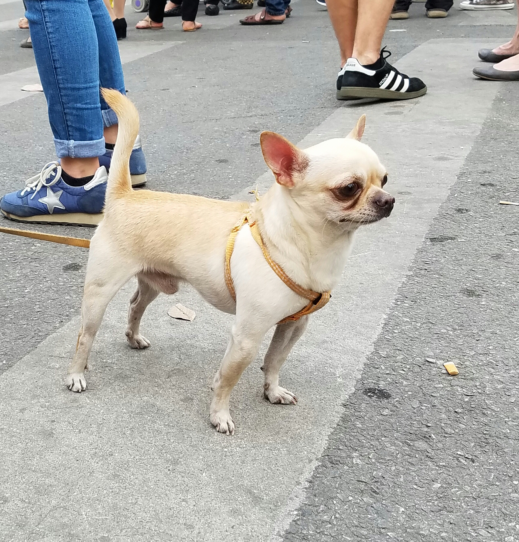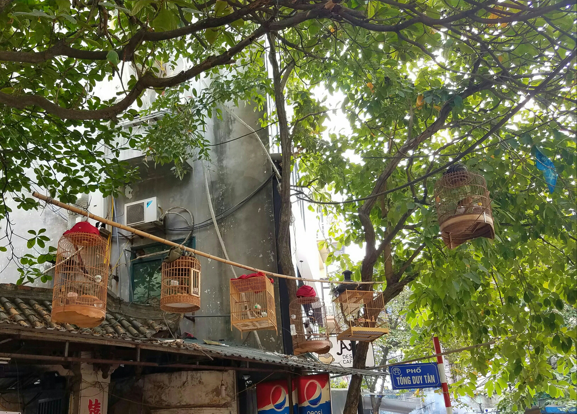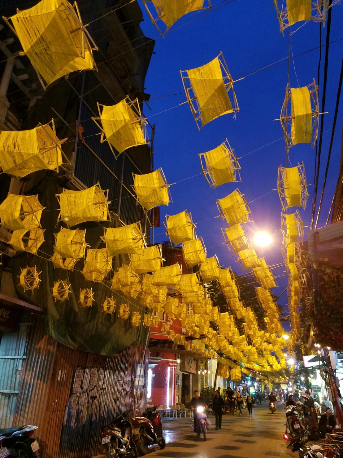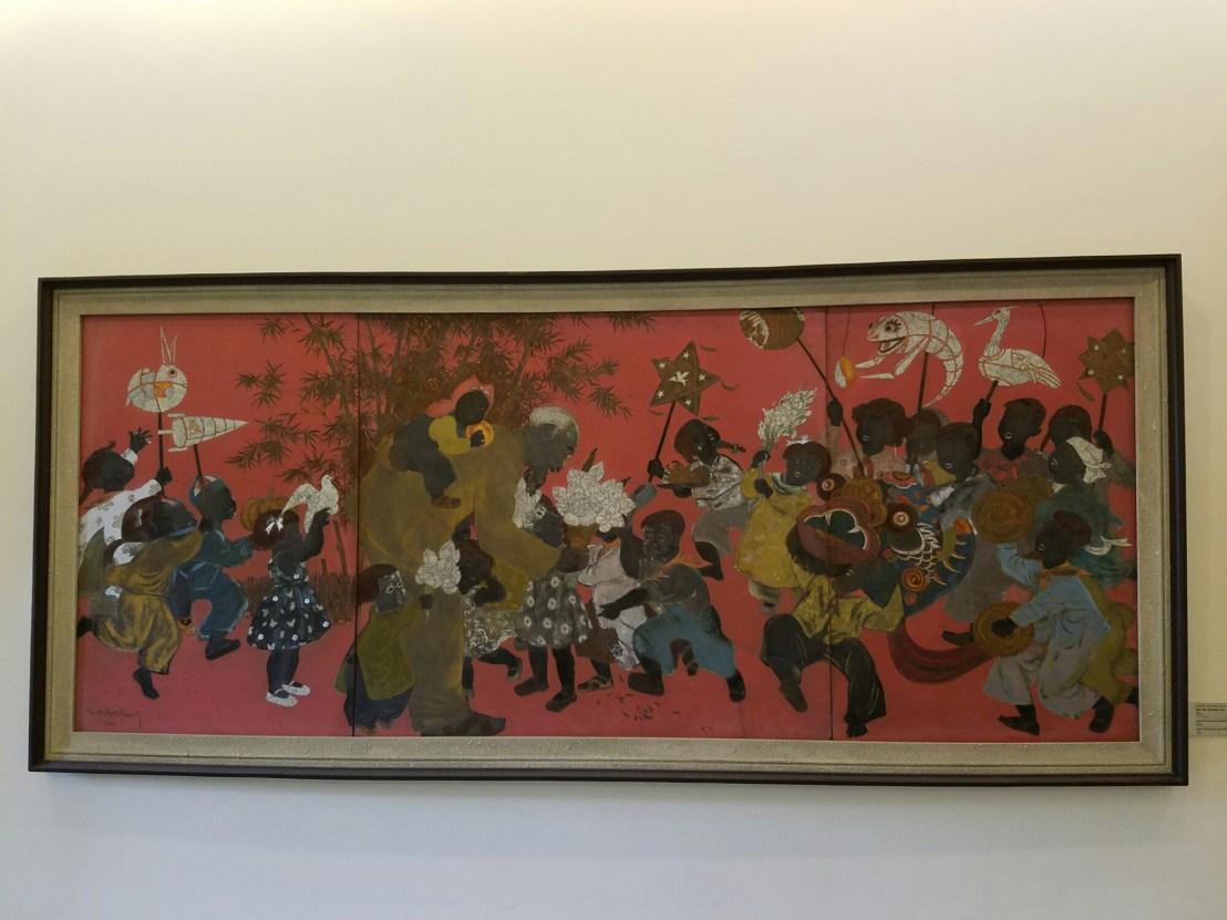 More folk art, a mask used in playsA temporary exhibit of contemporary lacquer paintingsThis very old wood panel is in great shape. It must have been inside for most of its centuriesAn entire floor of temple artI’m not bagging on only the french. This very good woodcut references the Christmas Bombings, where the US bombed the crap out of northern vietnam. They got their own back, dont worry. The action was disastrous for the US. Lots of American B52s shot down, lots of dead soldiers. Since this is a government museum, there were lots of depictions of this subject matter.Another pro-communist lacquer painting, this time good-natured uncle Ho playing with schoolchildrenEnough propaganda. This ridiculously cheap lunch was delicious. Some nameless fried fish bits, and oniony soupy noodles.A lot of eating establishments have birds in cages in the treesAfter my nap, I discovered that a bunch of streets had been closed off for some type of fair. The emergence of the little dog! Thank goodness. The pet situation had been looking grim. So many little dogs today!