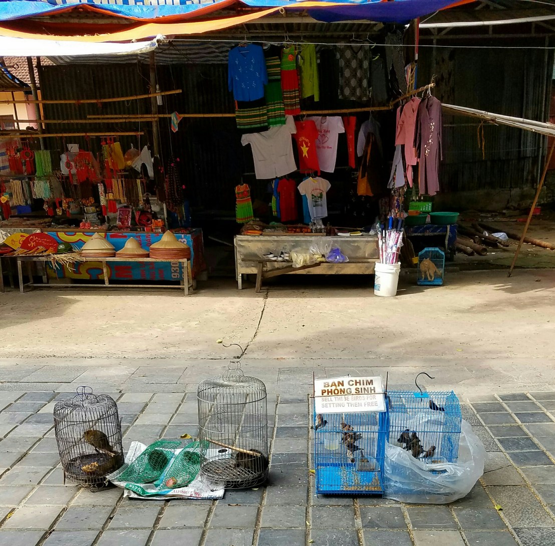 The idea is that buddhists have to do good on a pilgrimage. So they pay to have birds and etc set free. these poor creatures have probably been captured repeatedly