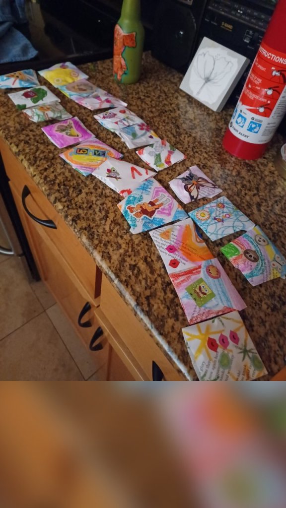 Made a bunch of little envelopes with Charisma for these mementos that I’ll be handing out on Sunday. It was a fun project to do and we used the new art supplies I bought last week.